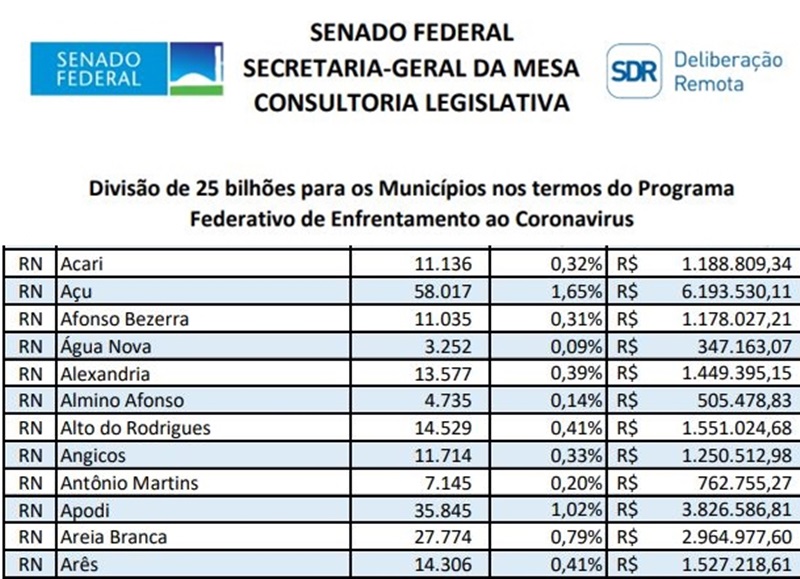 O Senado Federal com a Secretaria-Geral da Mesa e a Consultoria Legislativa elaborou tabelas consolidando os valores a serem recebidos pelo Programa Federal de Enfrentamento ao Coronavírus por cada Estado e Município do Brasil nos próximos dias. O auxílio foi aprovado neste dia 02. O tema segue para a Câmara dos Deputados.