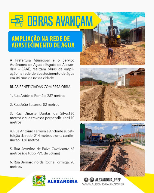 Essa obra totaliza 1.104 metros de extensão da rede de água, e faz parte do planejamento da administração municipal, que visa garantir o abastecimento de água potável em todos os setores da área urbana.